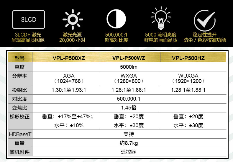 • 商品名称:索尼(SONY)投影仪 办公高清 激光工程投影机 VPL-P500HZ(5000 高清)