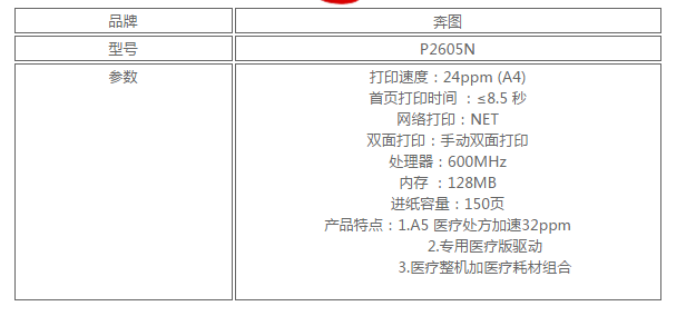 • 商品名称:奔图 P2605N A4 激光打印机 医疗行业