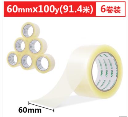 • 商品名称:得力(deli)6卷装 60mm*100y(91.4米)*45μm 高透封箱胶带打包宽胶带 30333