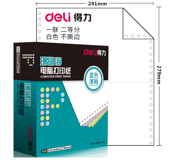 • 商品名称:得力(deli)珊瑚海一联二等分电脑打印纸 白色针式打印纸S241-1-1/2 80列