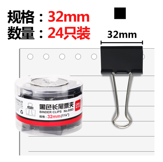 • 商品名称:得力(deli)24只32mm黑色长尾票夹 金属票据夹燕尾夹铁夹子 中号8563