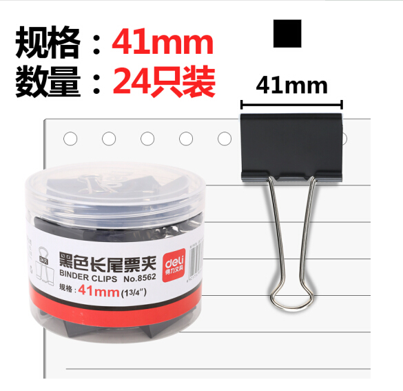 • 商品名称:得力8562长尾夹 得力(deli)24只41mm黑色长尾票夹 金属票据夹燕尾夹铁夹子 大号8562