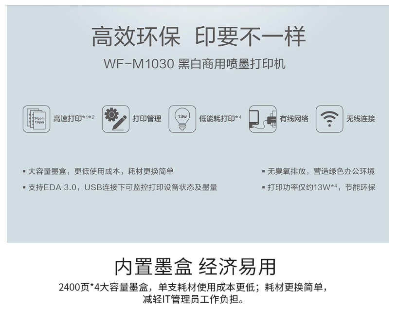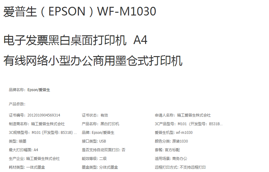 • 商品名称:爱普生(EPSON)WF-M1030 A4 电子发票黑白桌面打印机 有线网络小型办公商用墨仓式打印机
