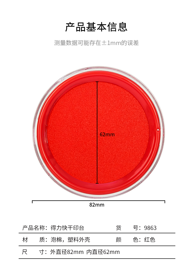• 商品名称:得力9863 圆形透明外壳快干印台 红色