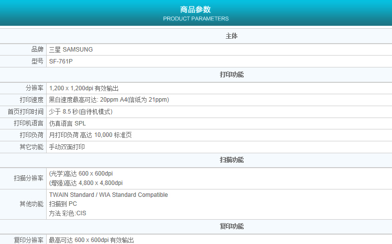 • 商品名称:三星(SAMSUNG)SF-761黑白激光多功能传真机 官方标配