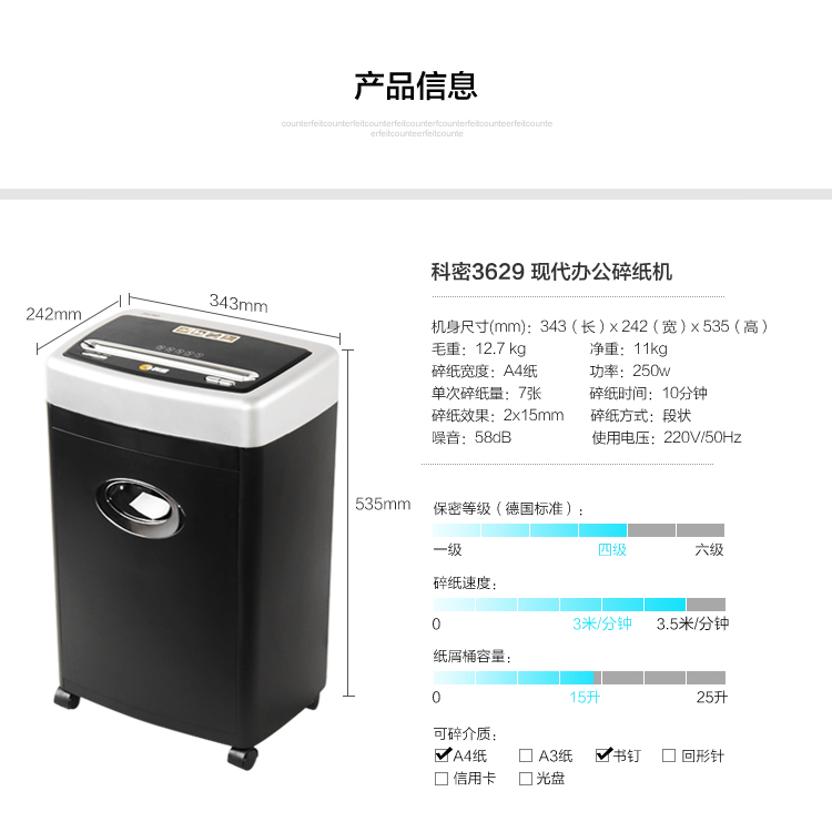 • 商品名称:科密 3629 高保密办公家用碎纸机