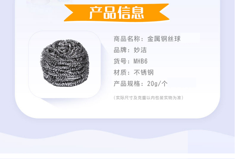 • 商品名称:妙洁钢丝球 金属钢丝球 6只装 30包/箱 计件;箱