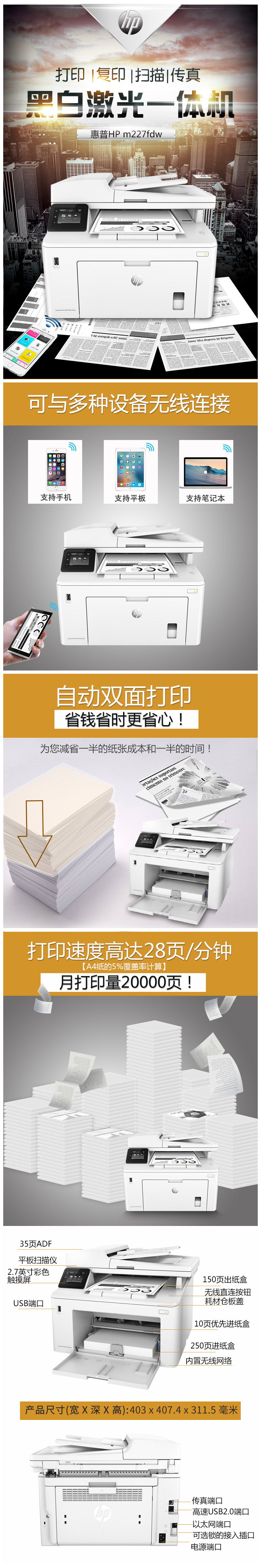 • 商品名称:惠普(HP)M227fdw四合一无线黑白激光一体机QQ无线物联