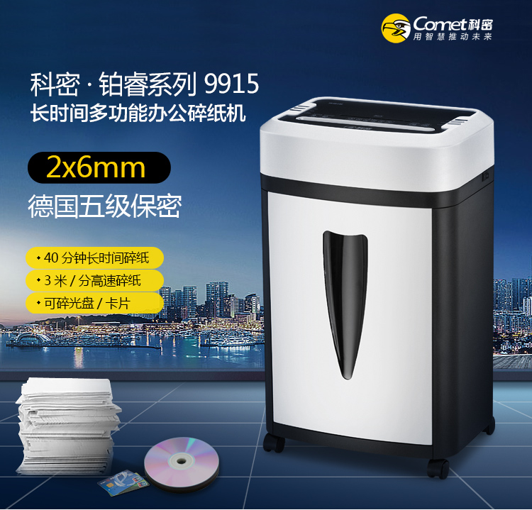 科密(comet)碎纸机 德国5级保密 长时间高速商用办公碎文件卡光盘粉碎机 铂睿系列 9915 碎40分钟 碎9张 2*6mm 25L容量