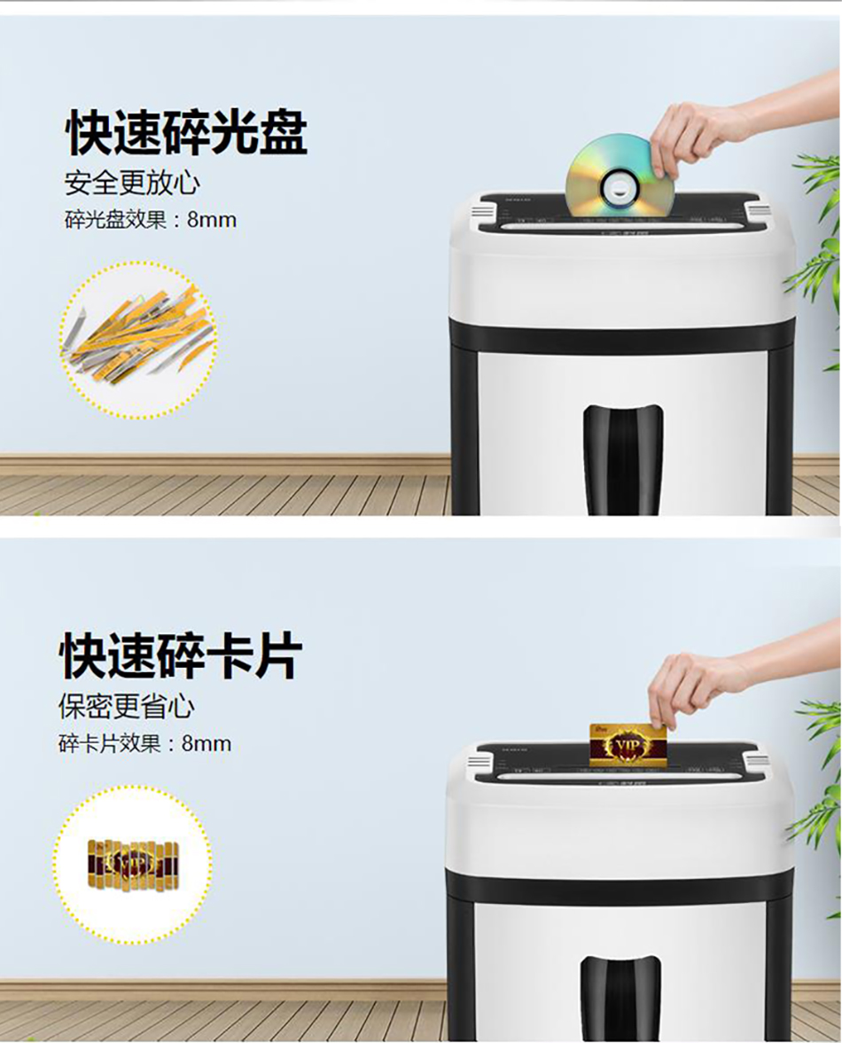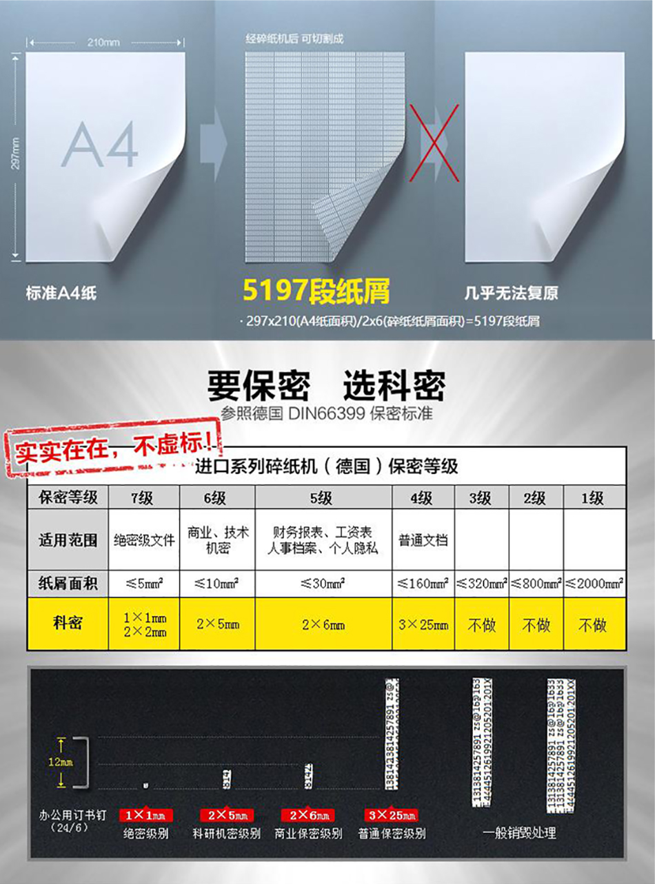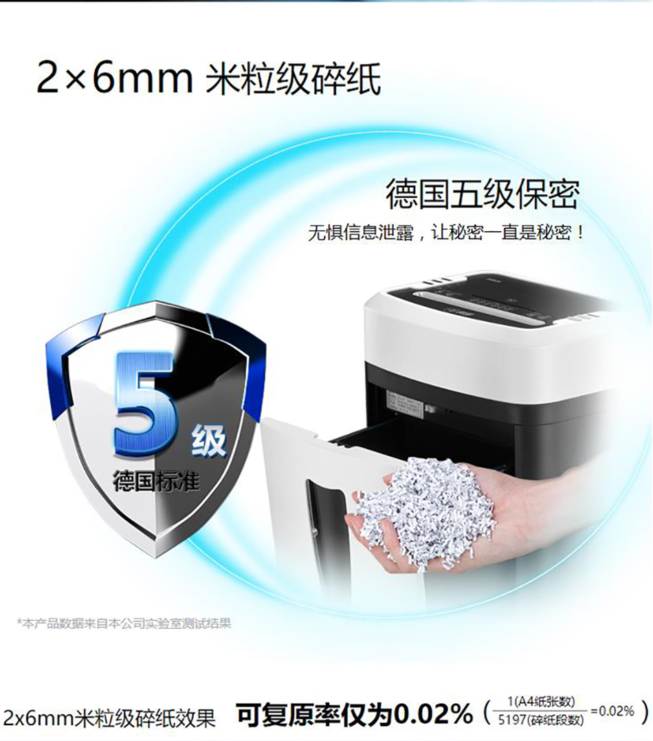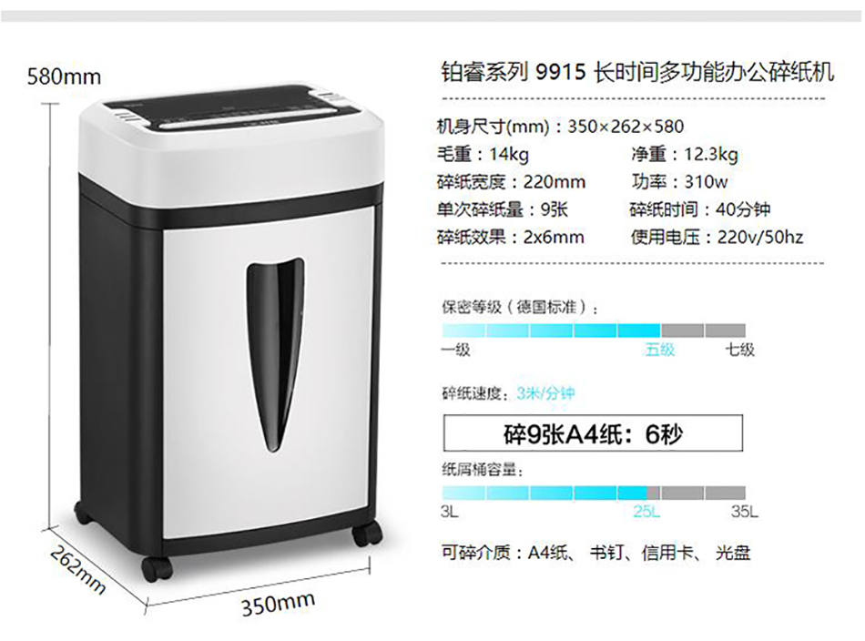 • 商品名称:科密(comet)碎纸机 德国5级保密 长时间高速商用办公碎文件卡光盘粉碎机 铂睿系列 9915 碎40分钟 碎9张 2*6mm 25L容量