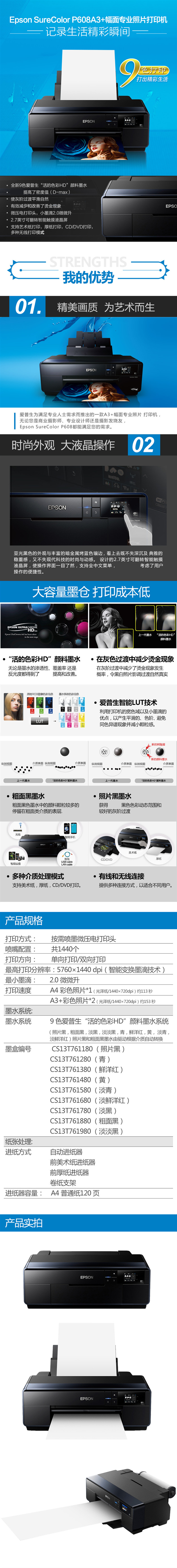 • 商品名称:爱普生(EPSON) SureColor P608 大幅面A3+幅面9色照片打印机 P608 9色A3+幅面打印机