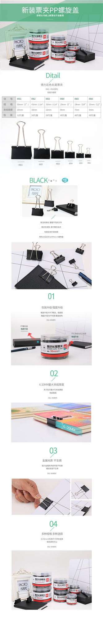 • 商品名称:得力(deli)24只32mm黑色长尾票夹 金属票据夹燕尾夹铁夹子 中号8563