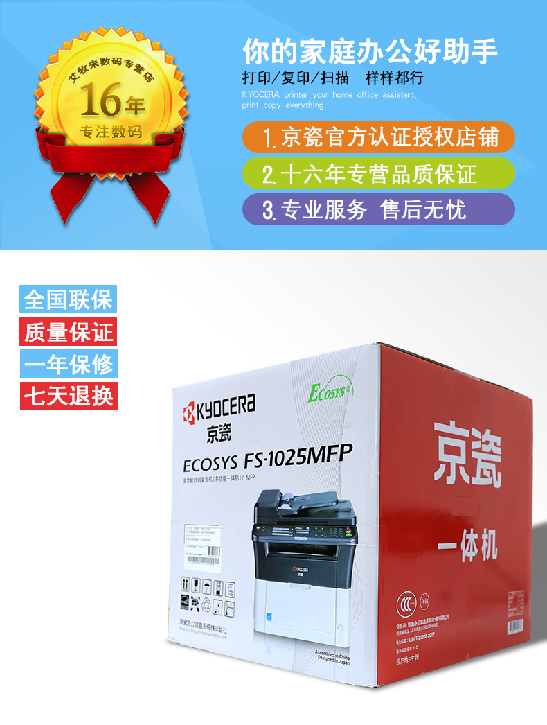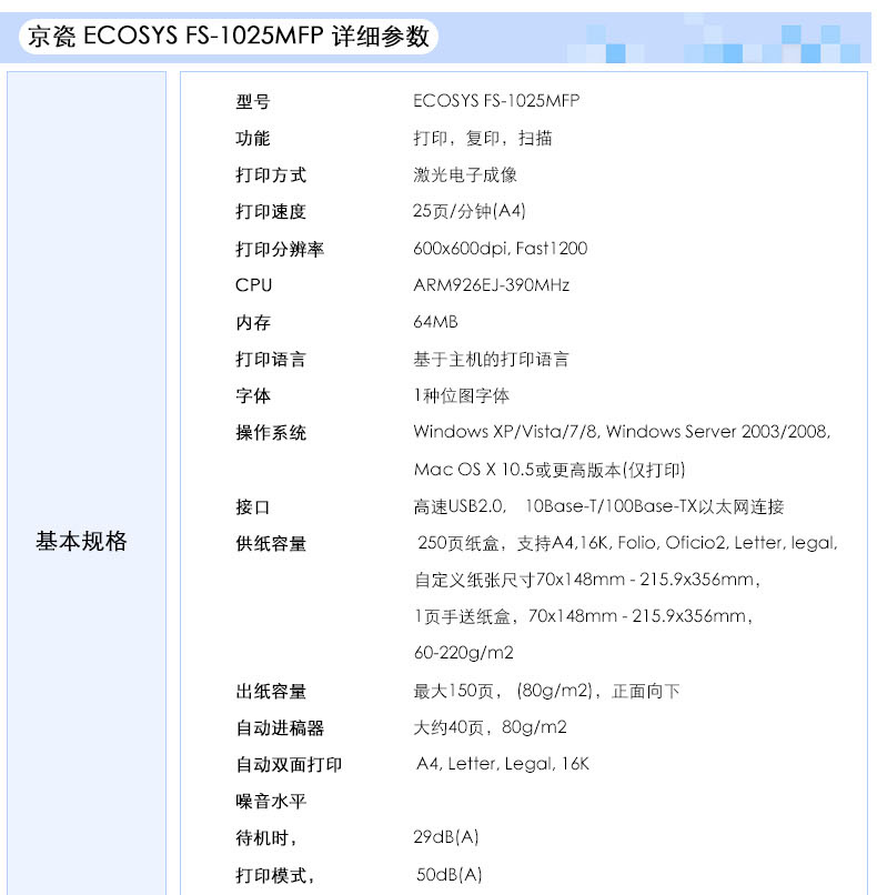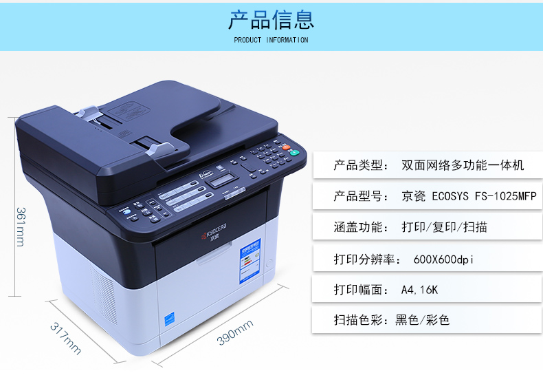 • 商品名称:京瓷(KYOCERA)FS-1025MFP 黑白激光多功能一体机 (打印 复印 扫描)