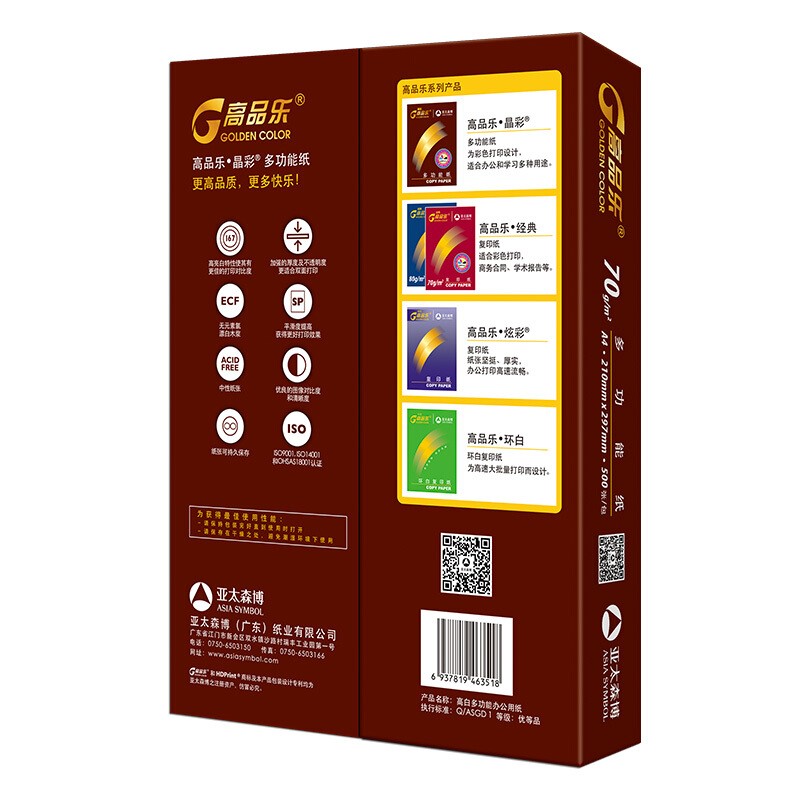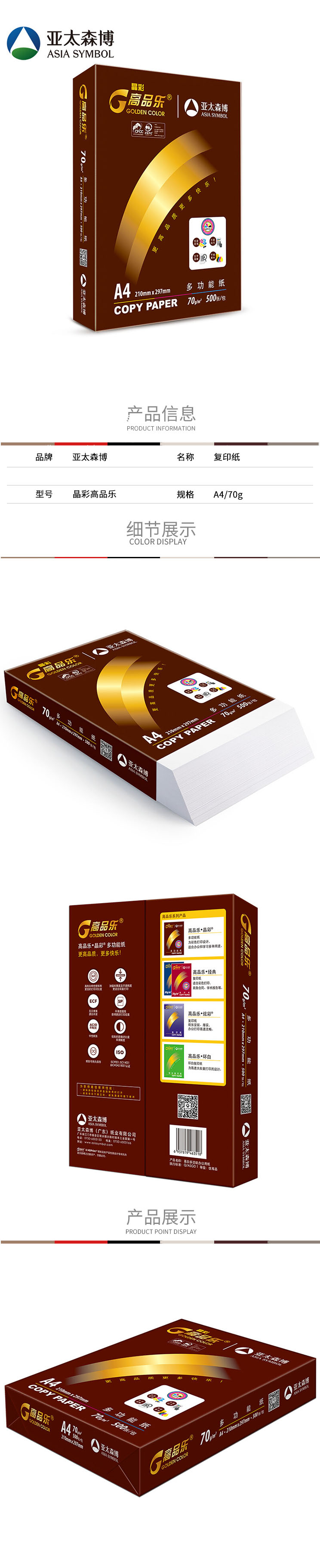 • 商品名称:亚太森博 晶彩高品乐A4 复印纸 70g 单包装 500张/包/每箱8包