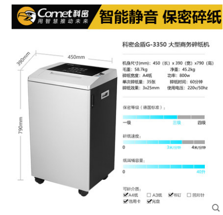 • 商品名称:科密金盾G-3350商用碎纸机大功率办公文件粉碎机大容量碎卡碎光盘